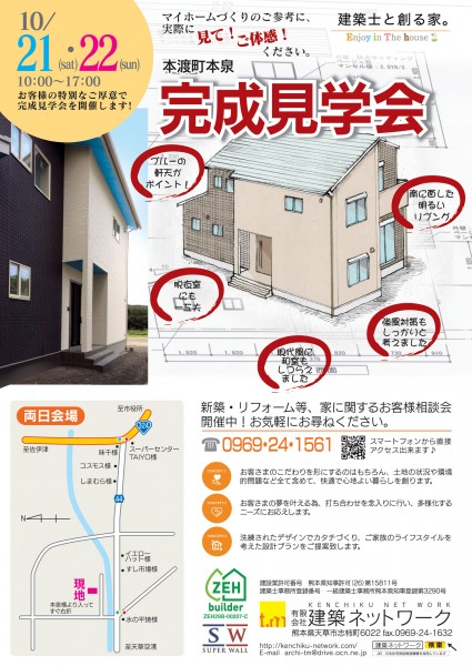 10月21日(土曜日)および22日(日曜日)の午前10時より午後5時時まで完成見学会を開催いたします。場所は天草市本渡町本泉です。詳しい場所は土曜日の朝刊のチラシをご覧ください。若しくはホームページからお問い合わせください。 蔦屋本渡店の住宅雑誌コーナーにもチラシを用意しております。皆様のお越しをお待ちしております。
