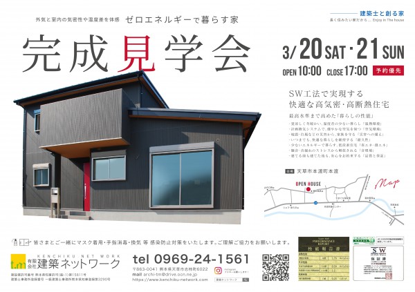 高気密・高断熱のスーパーウォール工法住宅が完成しました。完成見学会を開催いたします。今回は予約優先となっております。当日でも空いている時間帯にはご案内できます。皆様のお越しを待ちしています。