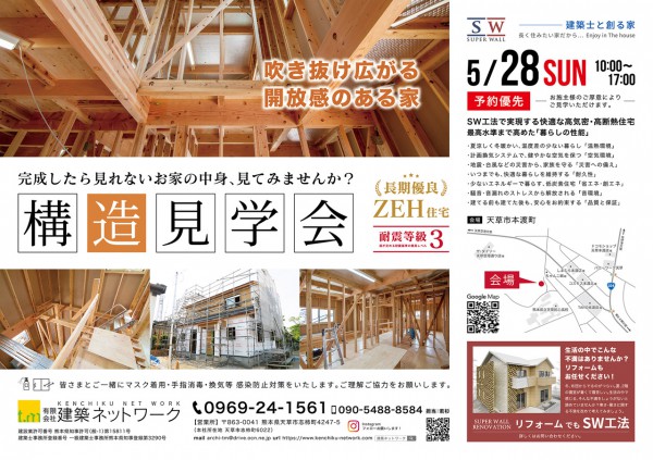5月28日(日曜日)に構造見学会を開催いたします。場所は本戸馬場の拓心高校近くです。完成してからでは見られない家の構造(断熱構造)を見に来ませんか。新築及びリノベの相談も受け付けておりますので、お気軽にお越しください。志柿町のモデルハウスもご覧いただけます。